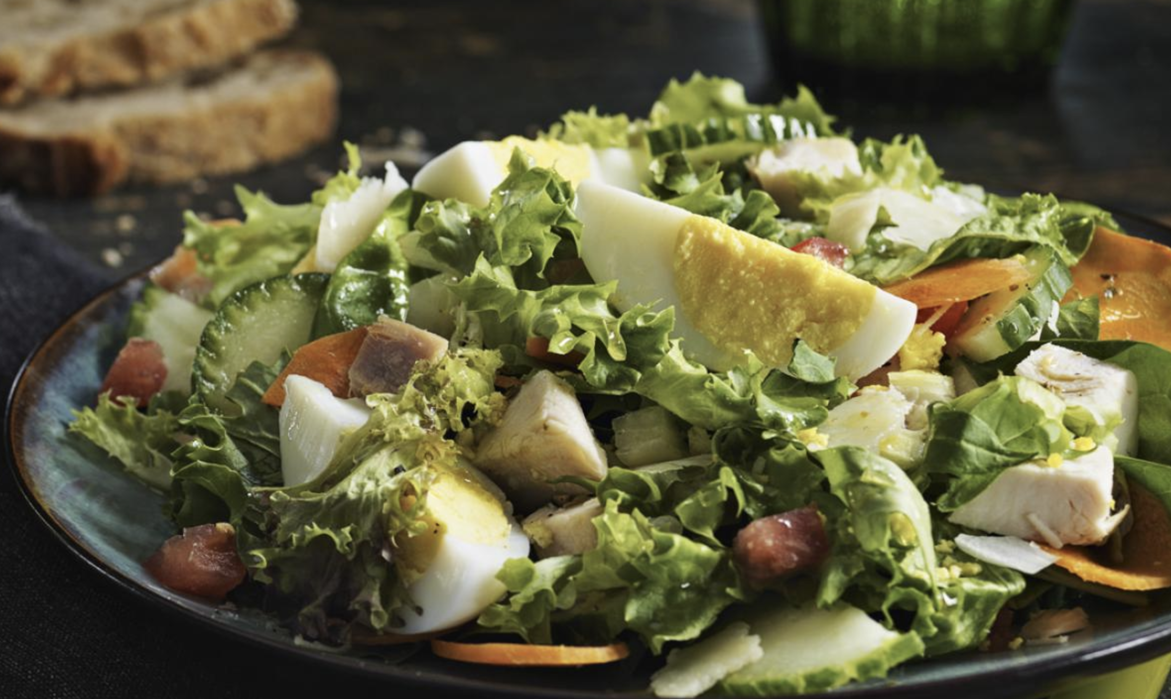 Salade verte, Choux rouge, Choux blanc, Salade de carottes, Maïs, Crouton de pain, Comcombre, Sauce à salade française