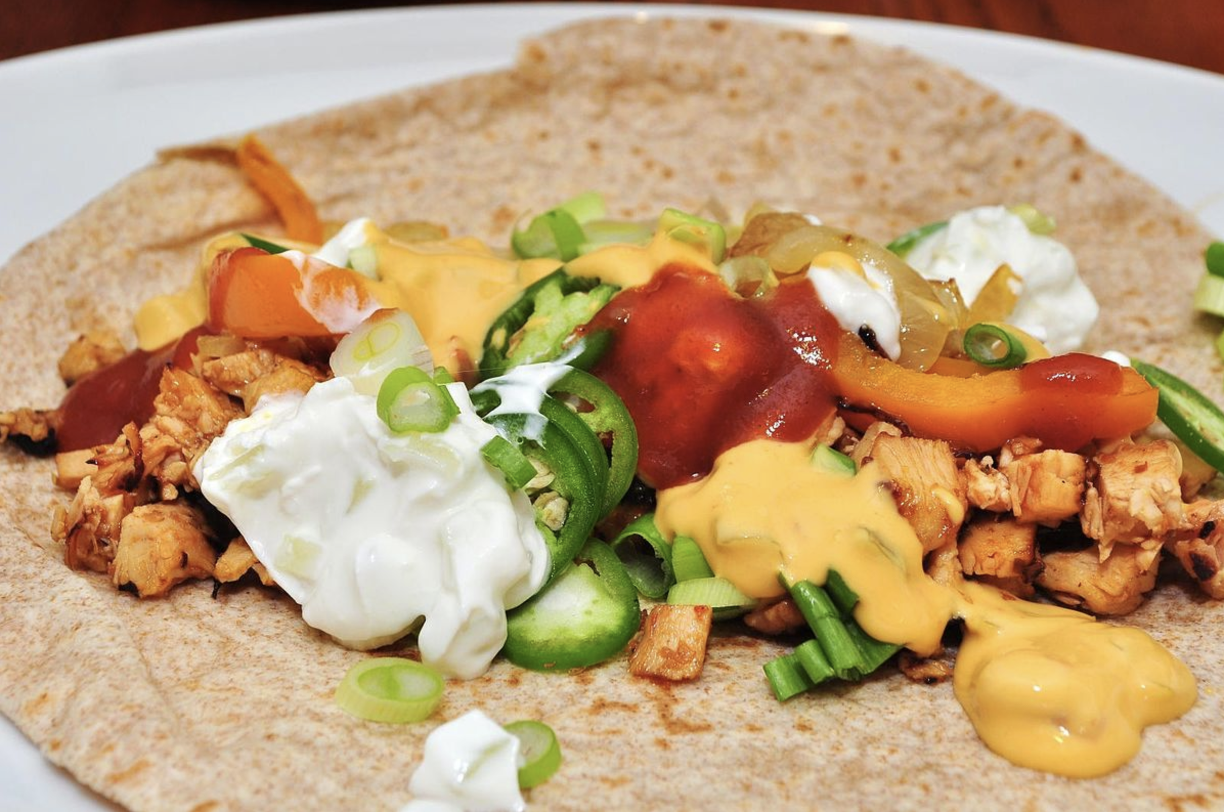 Pain pita, Emincé de poulet, Poivrons, Oignons, Epices mexicaine, Maïs, Fromage